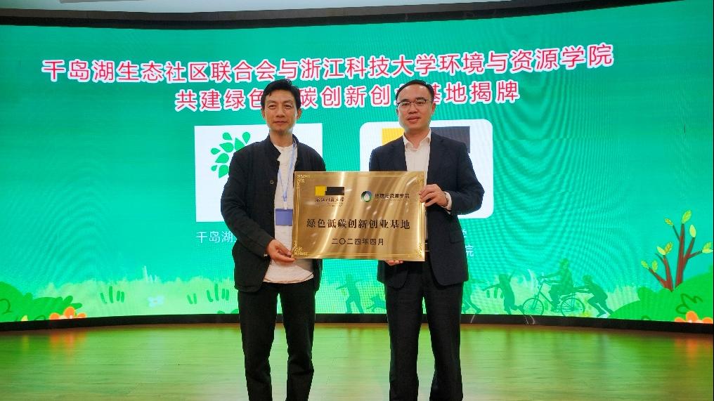 环资学院党委书记李俊与千岛湖生态社区联合会秘书长吴道元共同揭牌成立绿色低碳创新创业基地,双方表示将充分发挥各自优势,合作推动生态社区建设与淳安特别生态功能区绿色发展迈入崭新阶段,为全球生态文明社区建设贡献了智慧和方案。在交流会上,李俊作了题为《绿色低碳创新创业浙科探索与实践》的发言,得到与会人员关注和认可。