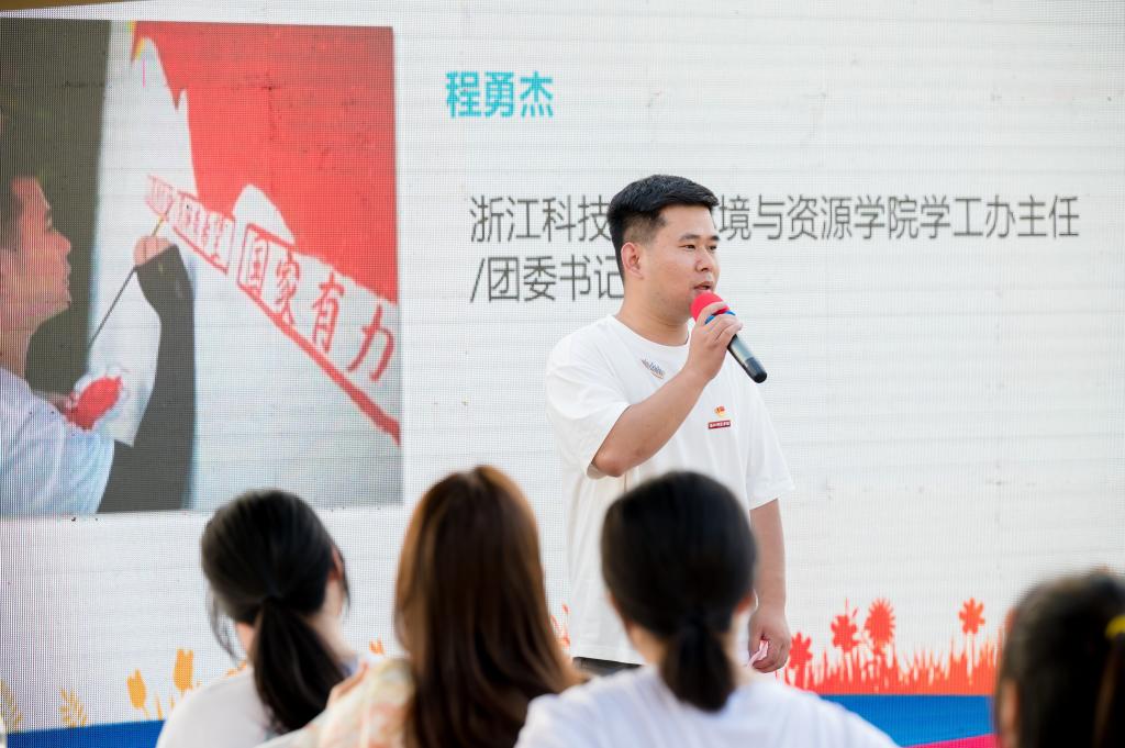 程勇杰代表实践指导教师发言,从浙江科技学院教师和淳安人双重身份作为切入点,介绍了浙江科技学院的办学历程、发展现状和“十四五”时期的发展战略,同时希望从人才培养、科技创新等方面,发挥好校地合作的枢纽作用,主动融入淳安的经济建设和社会发展。我院此次社会实践主题是“聚焦双碳 共赴共富”,依托淳安作为浙江省首创生态“特区”的背景条件,结合学院碳中和创新研究中心平台,重点调研在污染防治数字化改革、能源转型、生态保护与一二三产业融合发展等方面的具体情况。