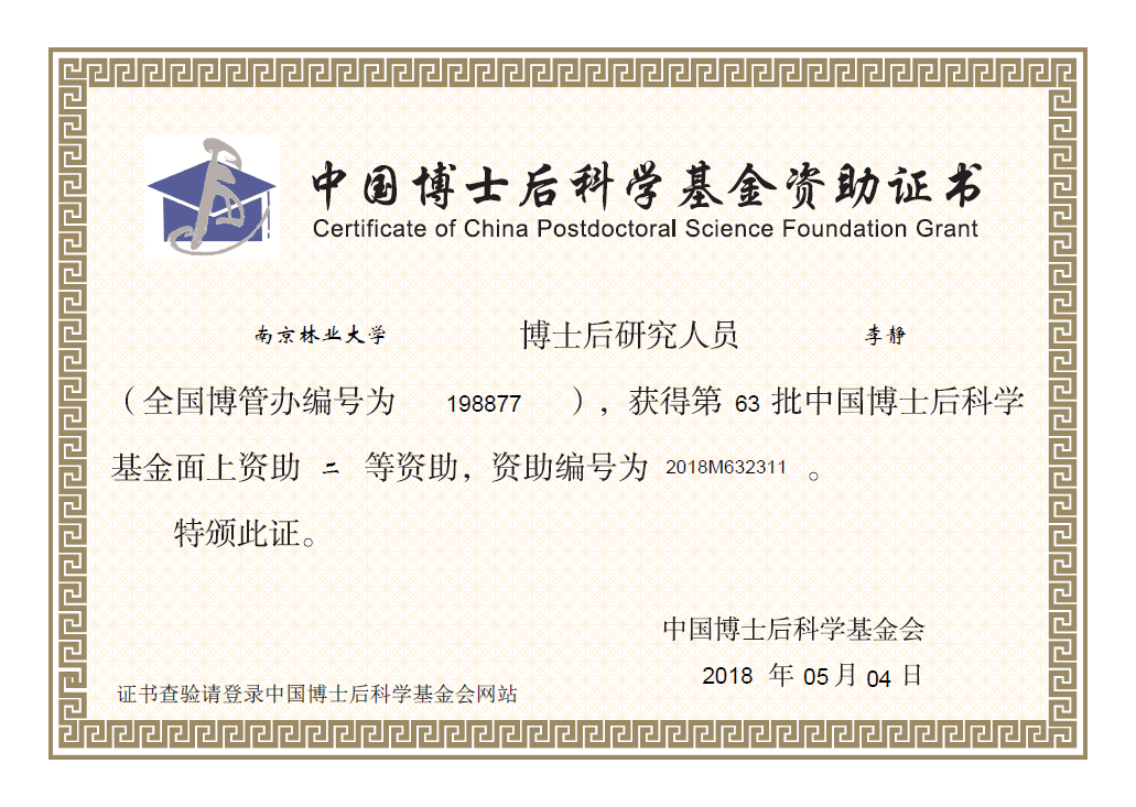 2018年5月9日,我院李静博士申请的项目《乙醇体系分离木素过程中苯酚诱导氧气的传质机制研究》成功获批轻工技术与工程一级学科的面上资助(资助编号:2018M632311)。该项目将依托我校浙江省废弃生物质循环利用与生态处理技术重点实验室、南京林业大学博士后流动站、浙江景兴纸业股份有限公司博士后工作站完成。