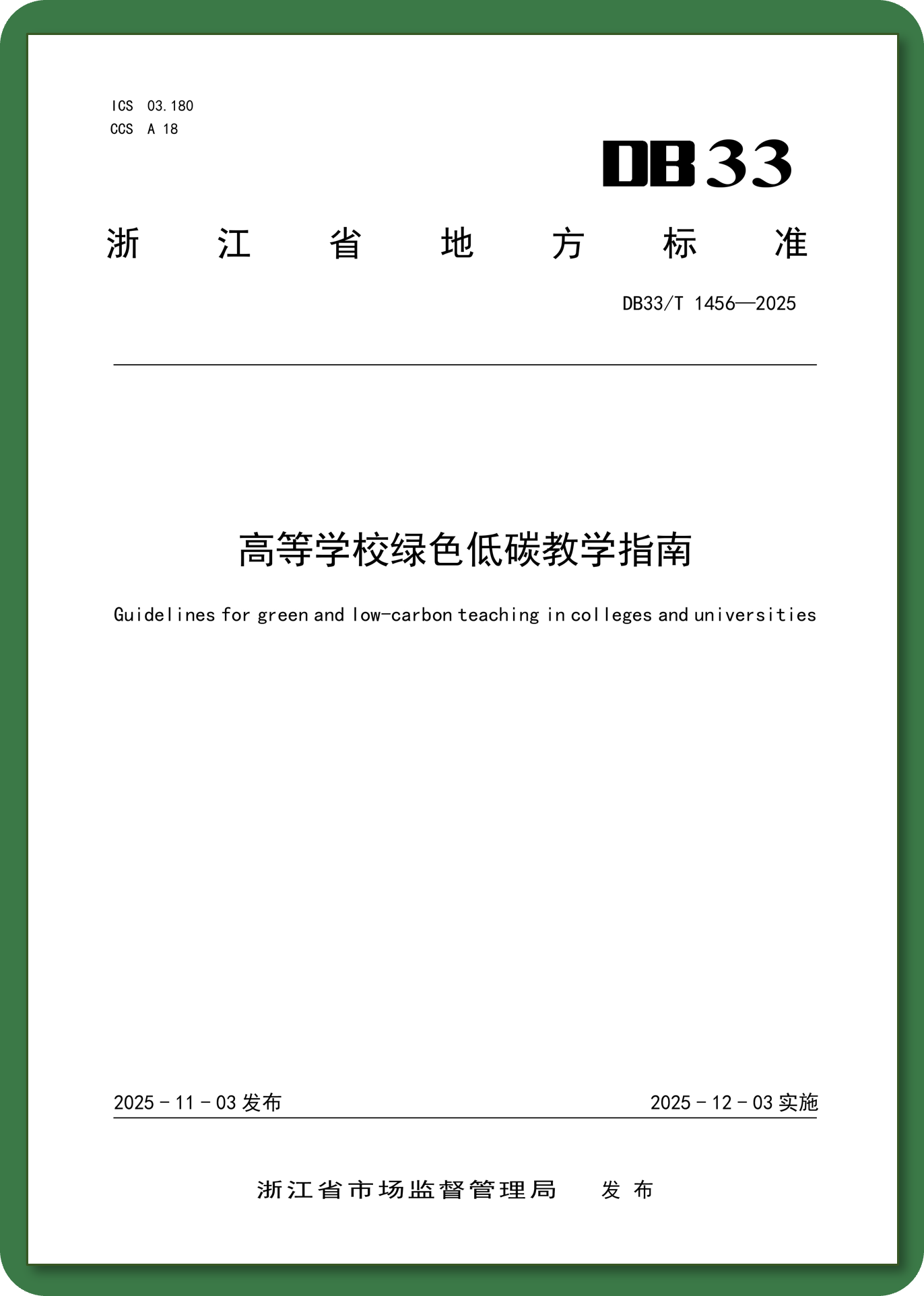 近日,由太阳成集团牵头,联合中国计量大学、浙江大学、浙江工业大学、浙江理工大学、浙江师范大学、温州大学等14所高校和浙江省循环经济学会、浙江省绿色科技文化促进会等社团组织共同起草的浙江省地方标准《高等学校绿色低碳教学指南》(DB33/T 1456-2025),经专家审定,已于2025年11月3日由浙江省市场监管局正式发布,并将于2025年12月3日正式实施。