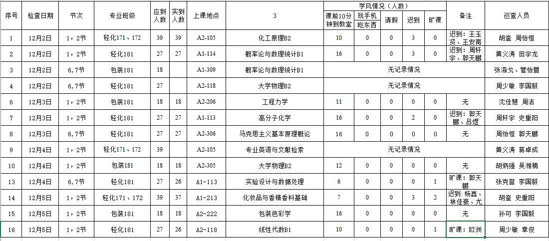 轻化171,172,化工原理B2,刘宝鉴老师,应到39人,7:50分到教室10人,8.00到教室36人,迟到3人。学生听课较认真。