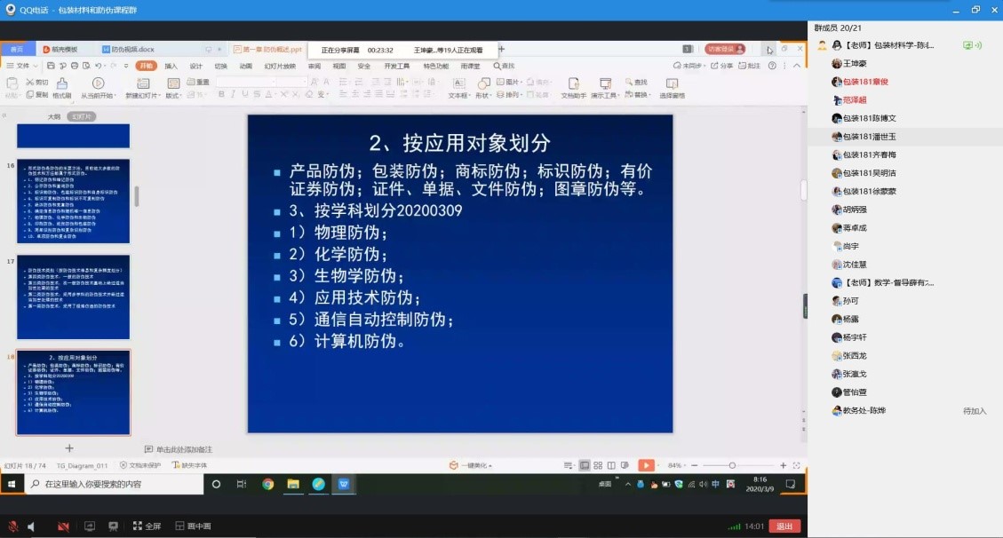 1、包装产品系统设计 1-16(1,2节) *实验中心楼-228 陈玲江 包装工程171,172。应到43人,实到43人,教师备课充分,线上课堂秩序良好。