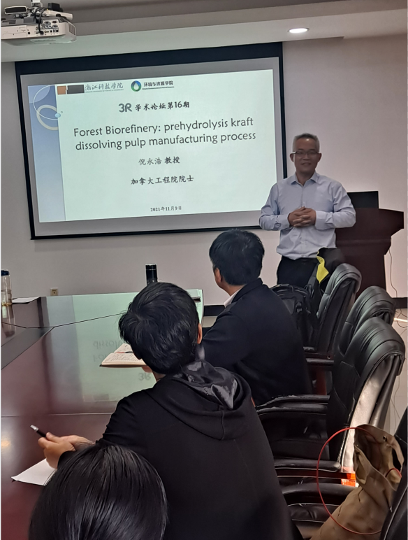 2021年11月9日下午,加拿大工程院院士、加拿大国家资深学者、新不伦瑞克大学化学工程系倪永浩教授来访suncitygroup太阳集团并为第16期“3R”论坛做题为“Forest Biorefinery: prehydrolysis kraft dissolving pulp manufacturing process”的学术报告,刘赫扬院长、胡志军副院长、张进副院长、学院专业教师以及研究生等四十余人参加报告会。