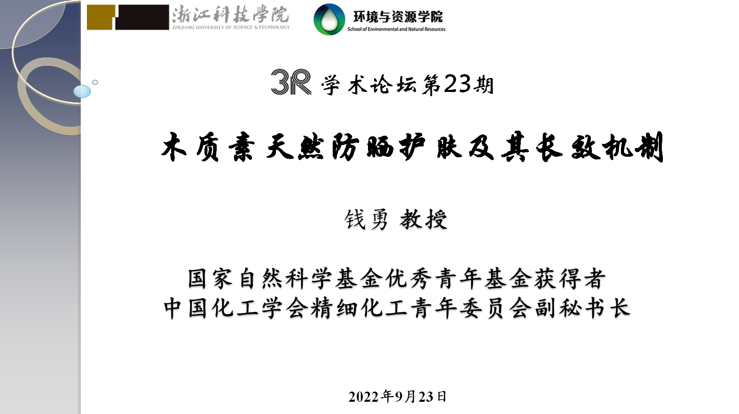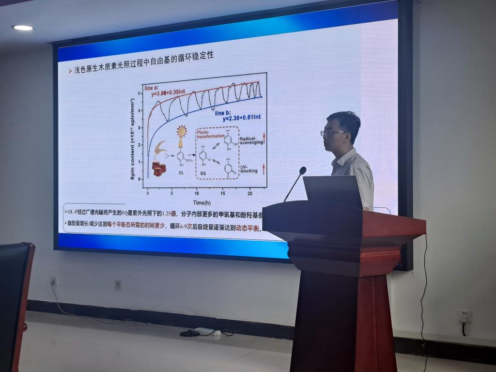 在学术报告中,钱勇教授首先对自己的研究方向、皮肤晒伤机制、防晒方式和防晒化妆品的发展概况做了简要介绍,随后从“利用天然木质素制备防晒护肤品”这一理念的产生、天然或改性木质素的添加对防晒效果的影响以及木质素的长效抗紫外机制等角度展开,详细讲述了利用天然或工业木质素、浅色化木质素、木质素规则纳米球、ATRP接枝改性木质素和防晒剂共混制备防晒护肤品,木质素/防晒剂复合纳米胶囊制备的工艺技术和实际效果,重点讲解了防水抗渗型木质素防晒纳米颗粒-多巴胺接枝改性和防水抗渗型木质素防晒纳米颗粒-原位脱甲基改性等方式对合成防晒护肤品性能的影响,分析了木质素长效抗紫外的机制、自由基在光照过程中的循环和稳定性机制以及自由基反应的动力学机制。