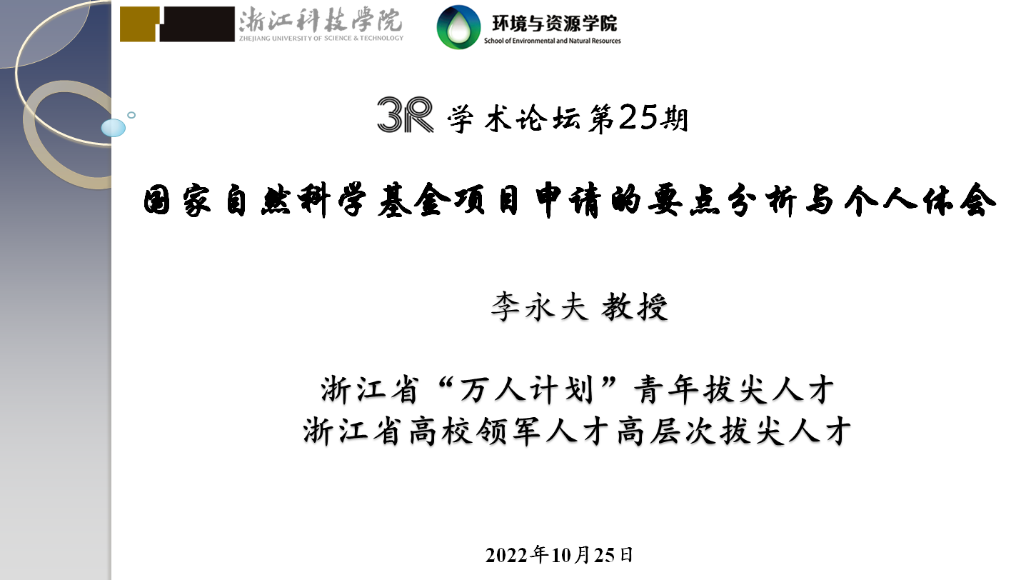 2022年10月25日下午,浙江省“万人计划”青年拔尖人才、浙江省高校领军人才高层次拔尖人才、浙江省杰出青年科学基金获得者、浙江农林大学博士生导师李永夫教授到访suncitygroup太阳集团并作题为“国家自然科学基金项目申请的要点分析与个人体会”的学术报告,报告会由张进副院长主持,学院环境工程系和轻化工程系二十余位专业教师参加了报告会。